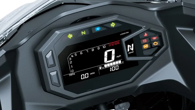 メーターはハイコントラストフル液晶で見やすく、スマホアプリ「RIDEOLOGY THE APP MOTORCYCLE」にも対応しています。