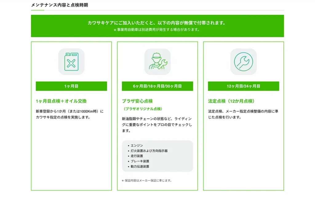 内容としては、1ヶ月目点検に加えて、3年間※1の定期点検とオイル交換※2(オイルフィルター含む)を無償※3で実施する、というサポートです。